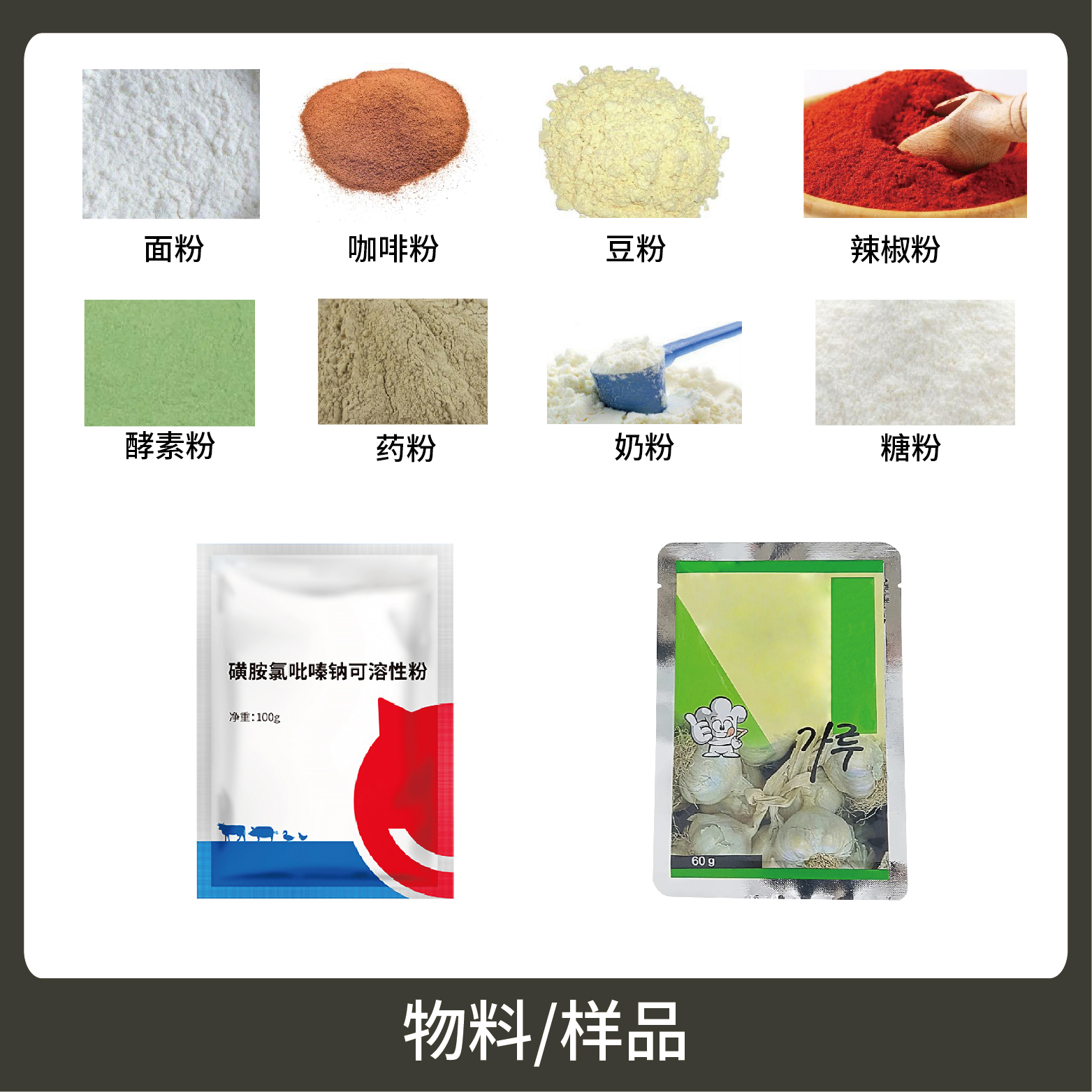 1、適用于食品、醫(yī)藥、化工、化妝品行業(yè)中顆粒、粉劑、液體、醬料等物品的計(jì)量包裝,如:調(diào)味粉、蛋白質(zhì)粉、營養(yǎng)粉等。
